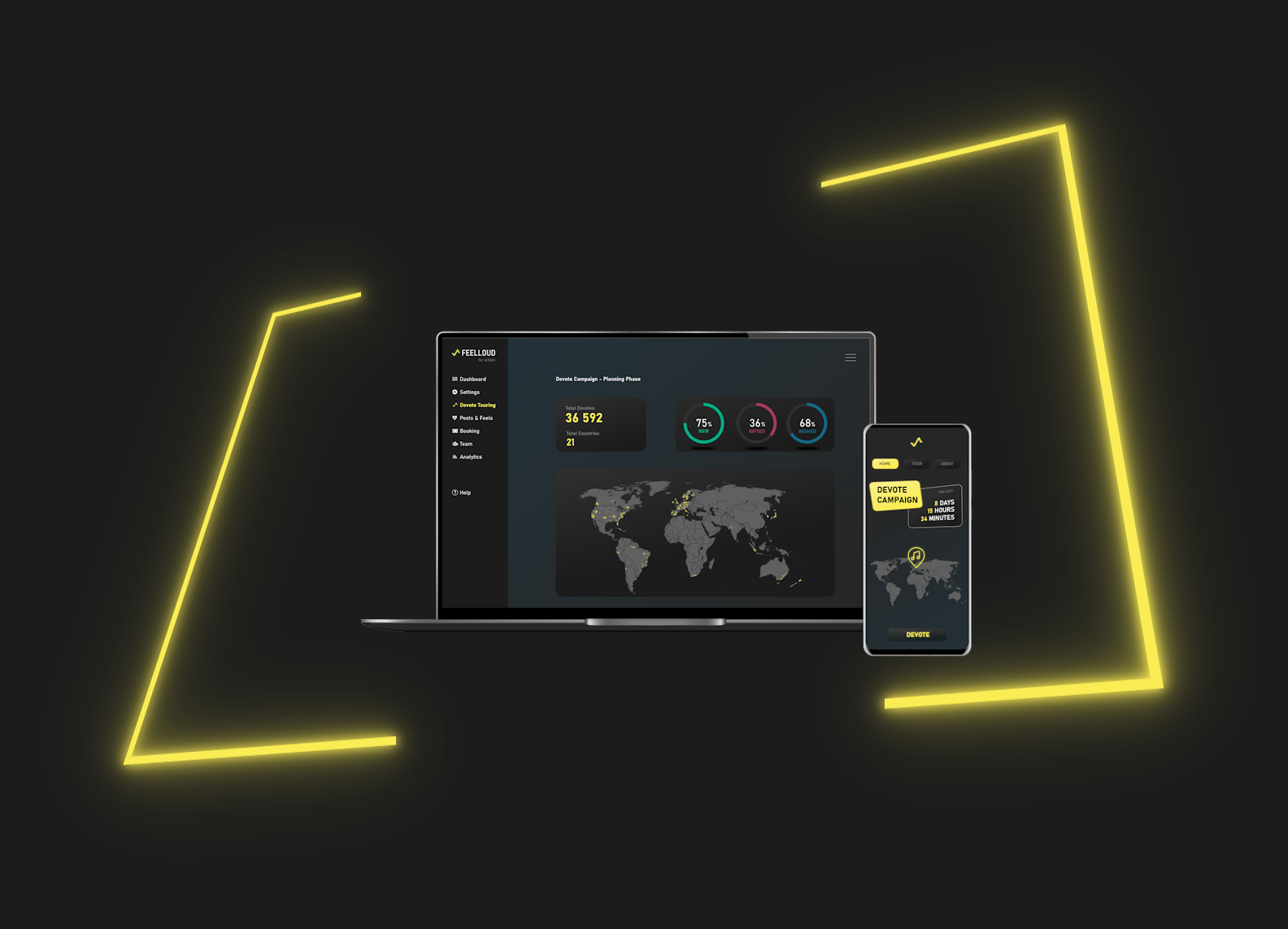 Create your free account on FEELLOUD to affect concert location and more via DEVOTE-campaigns. Connect to your favourite bands and artists like never before on a platform made for music and concerts. A platform with focus on the best thing there is, music.